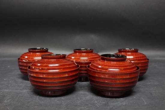□新古品 ■輪島塗海松貝蒔絵煮物椀5客 ■桂月作 ■経13.3cm 高さ10cm ■定価 1,200,000円 ■特価 110,000円 ※煮物椀名品です。素朴な生地を活かし内に斬新な貝の蒔絵センス抜群の椀です。